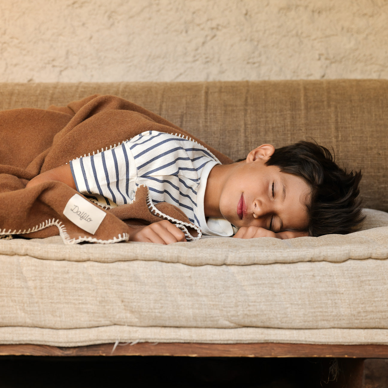 Wolle und Kaschmir sind natürliche Garne mit unglaublichen Eigenschaften: Sie isolieren, wärmen, fühlen sich weich an und sind vor allem ewig haltbar. Unsere Decken werden aus regenerierten Fasern hergestellt, die durch ein sorgfältiges Verfahren zur Aufarbeitung von recycelten Stoffen gewonnen werden, denen wir einen Anteil an Frischfasern hinzufügen. Das Ergebnis ist ein sehr weiches, anschmiegsames und langlebiges Garn mit geringer Umweltbelastung... Eine Kuscheldecke für uns und unseren Planeten.