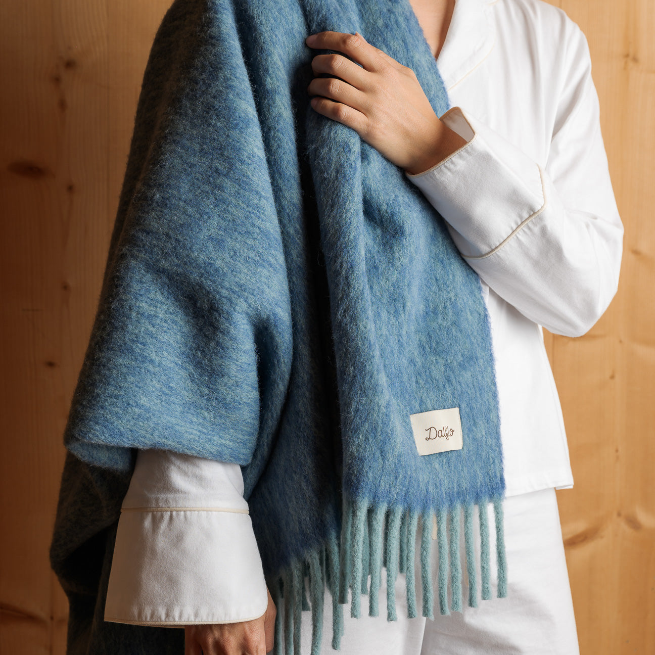 - Aussehen: Die Bouclé-Webstruktur und das leicht angeraute Finish ergeben eine elegante Mélange-Optik mit einem aquamarinblauen Kettfaden und kontrastierendem Schussfaden (weiß für "Mittagsblau", himmelblau für "Mitternachtsblau").