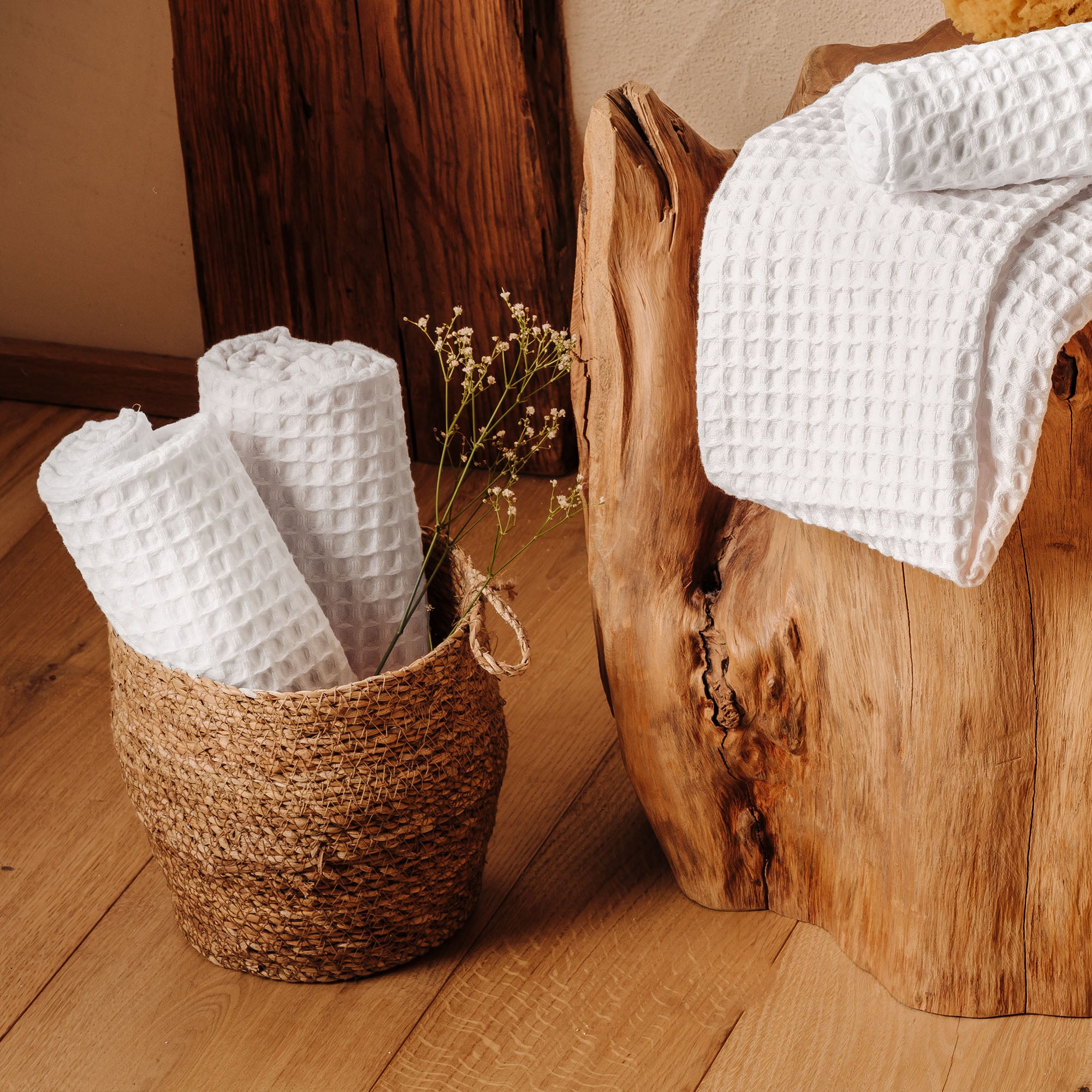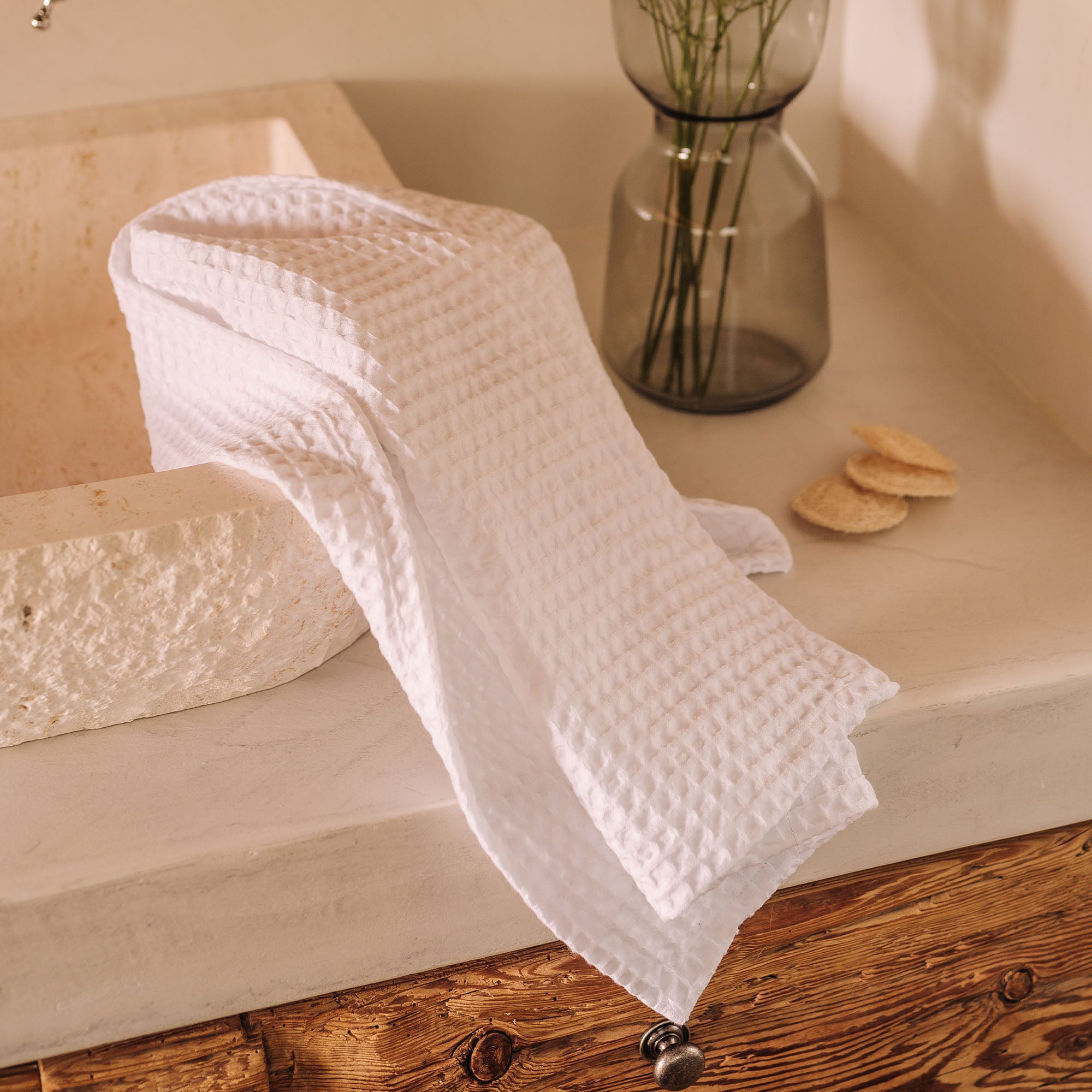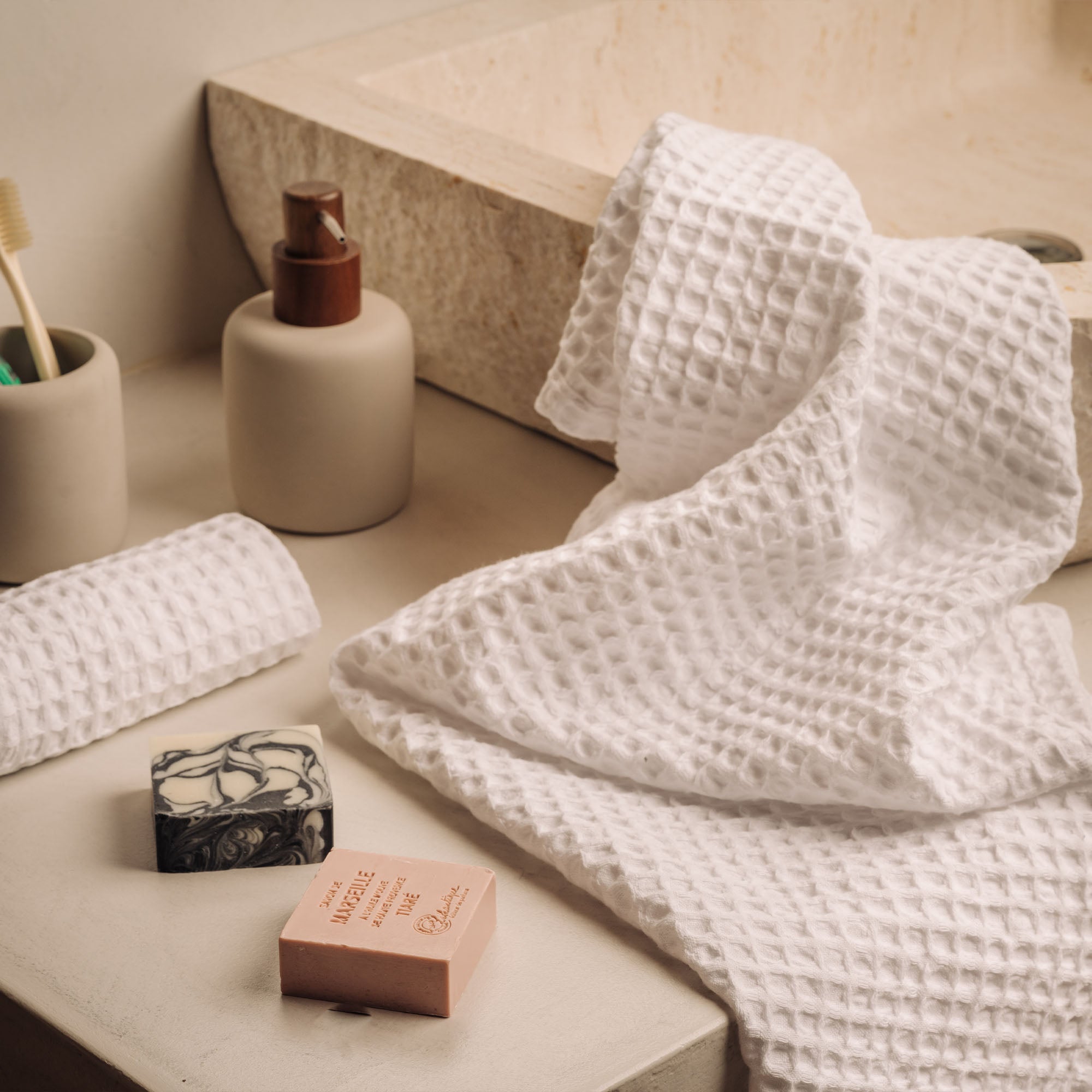 Die Waffelpiqué-Linie zeichnet sich durch ein 380 g/m2 reines Baumwollfrottee aus, das speziell verarbeitet wurde, um ein bienenstockähnliches Aussehen zu erzielen. Diese dreidimensionale Karostruktur garantiert maximale Saugfähigkeit bei minimalem Gewicht, ohne an Weichheit einzubüßen. Die perfekte Linie, die dich überallhin begleitet.
