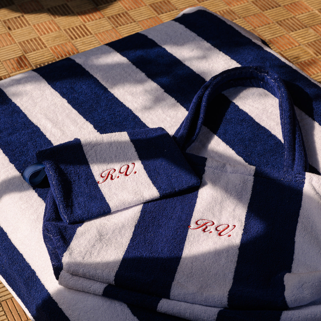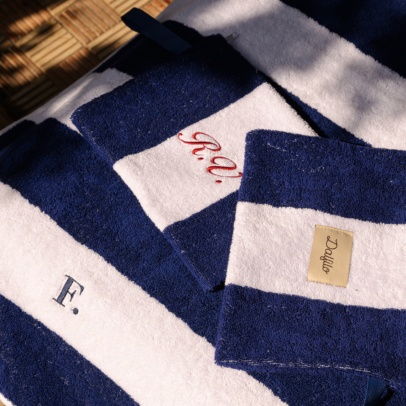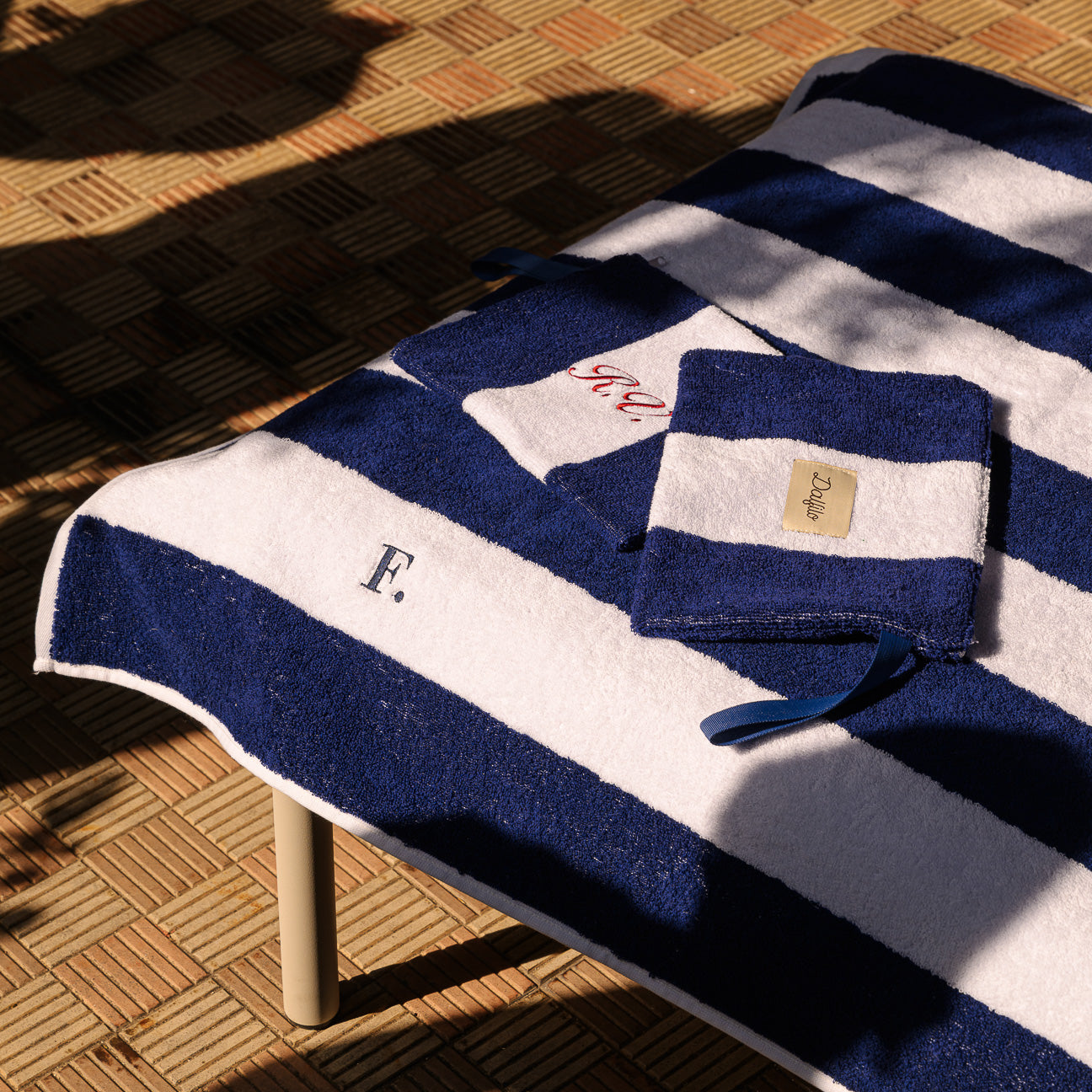 - Portofino-Strandtuch: 100 x 180 cm, aus reiner Baumwollfrottee (450 g/m²), mit 2 cm weißem Satinsaum und Stickoption zur Personalisierung.
