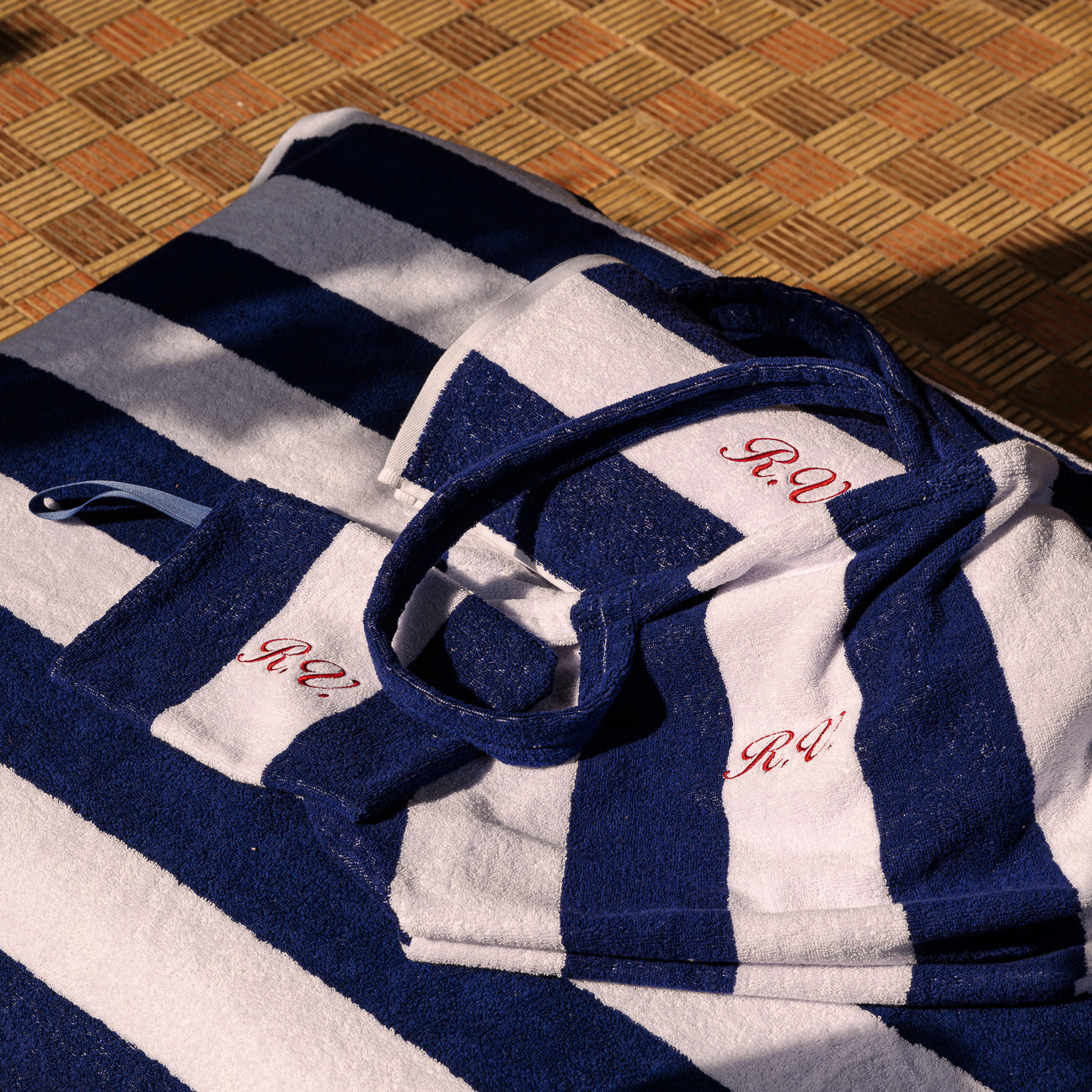 Die Produkte des Portofino All-in-Sets bestehen aus natürlichem Baumwollfrottee mit 9,5 cm breiten Jacquard-Streifen und IDH-Garnfärbung, die beständig gegen Sonne, Chlor und Witterung ist. Das Muster ist auf beiden Seiten sichtbar.
