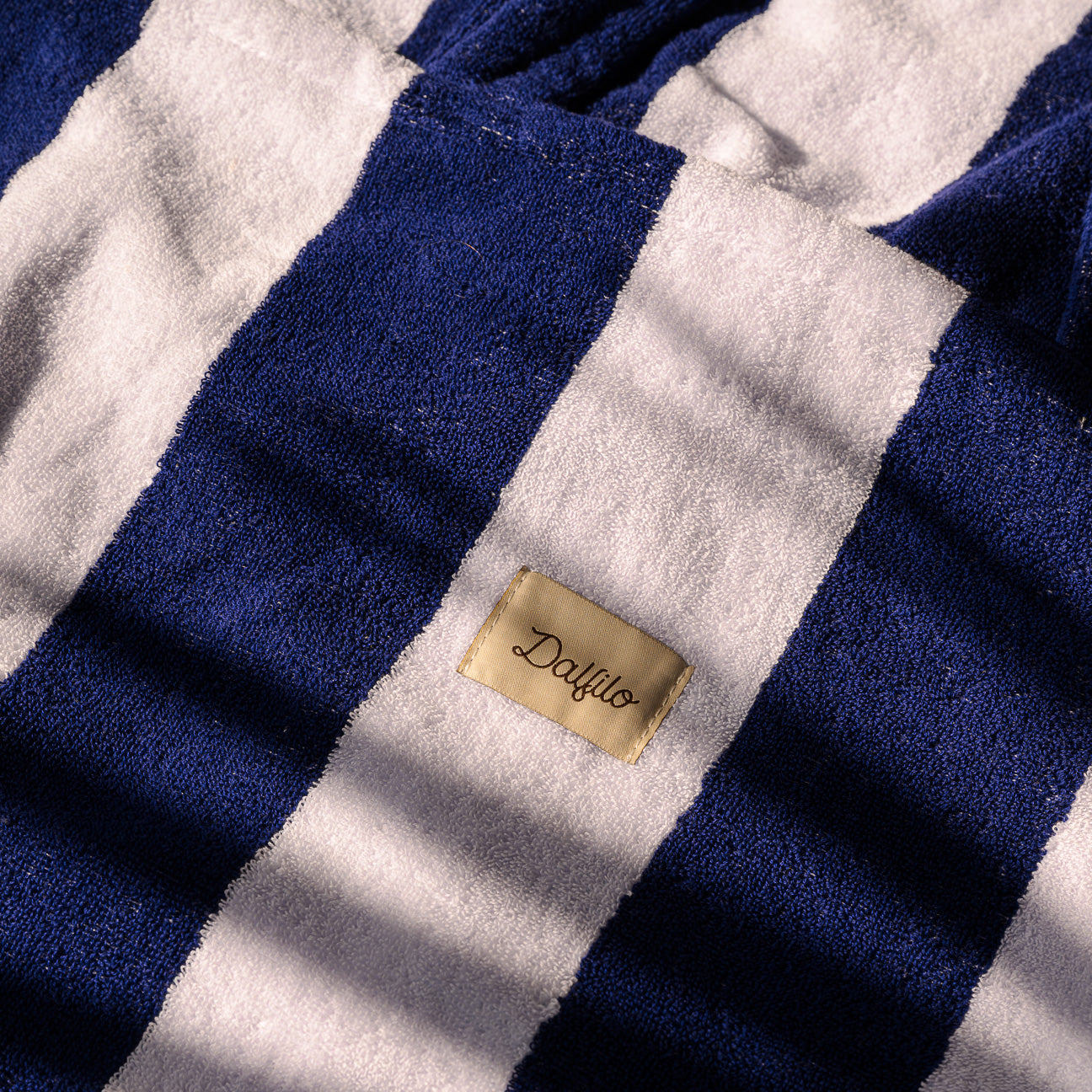 - Portofino-Strandtasche: 47 x 50 x 19 cm, ungefüttert, geräumig und leicht, mit farblich abgestimmten Frottee-Henkeln, Dalfilo-Etikett auf der Vorderseite und personalisierbarer Stickerei auf der Rückseite.