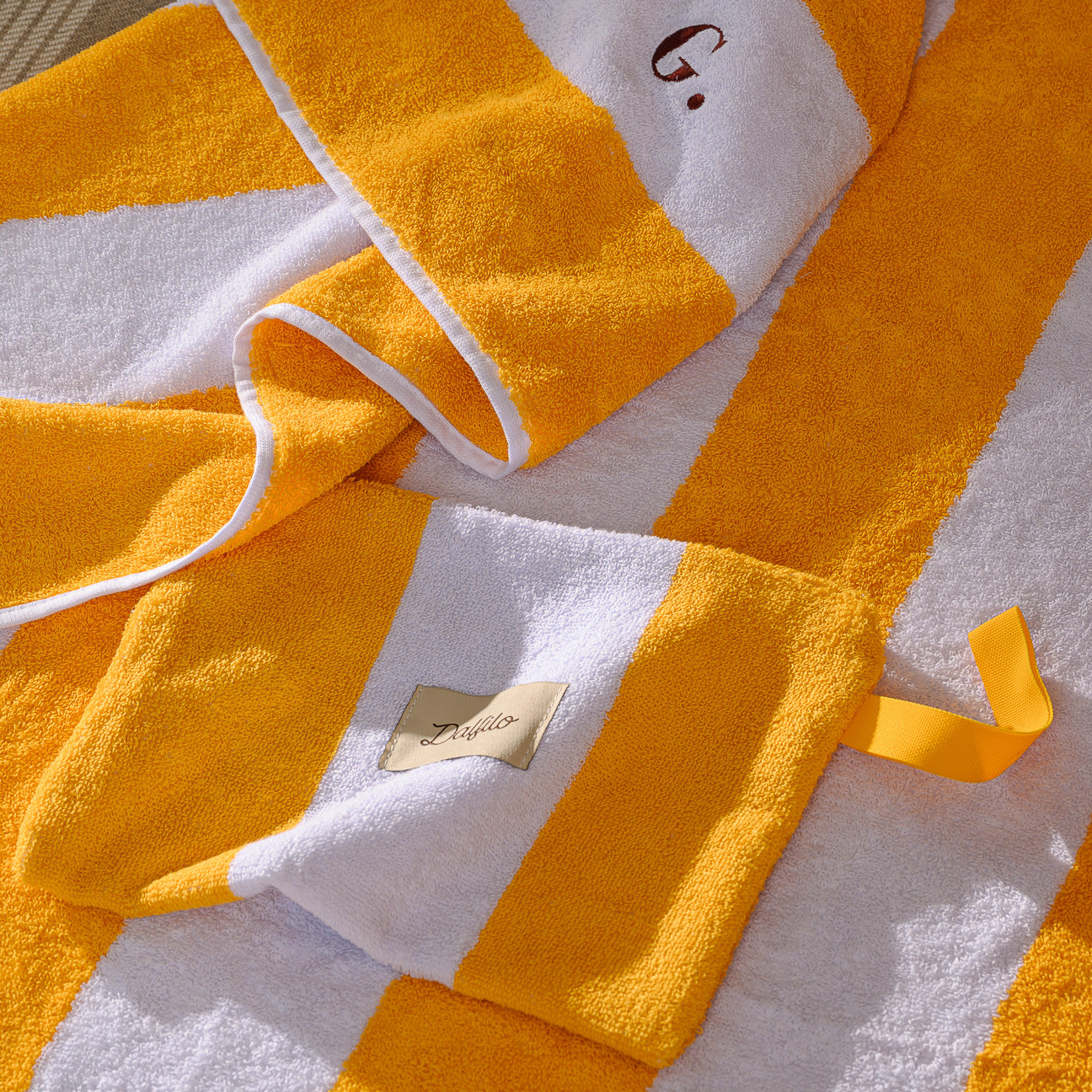 Jedes Teil der Dalfilo-Strandlinie entsteht am Webstuhl – aus dem Zusammenspiel von weißen und farbigen Garnen, garngefärbt mit der IDH-Technik für maximale Beständigkeit gegen Sonne, Chlor, Witterungseinflüsse und häufiges Waschen.