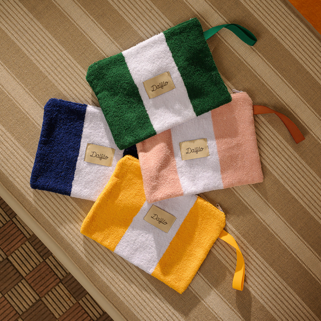 Jedes Teil der Dalfilo-Strandlinie entsteht am Webstuhl – aus dem Zusammenspiel von weißen und farbigen Garnen, garngefärbt mit der IDH-Technik für maximale Beständigkeit gegen Sonne, Chlor, Witterungseinflüsse und häufiges Waschen.
