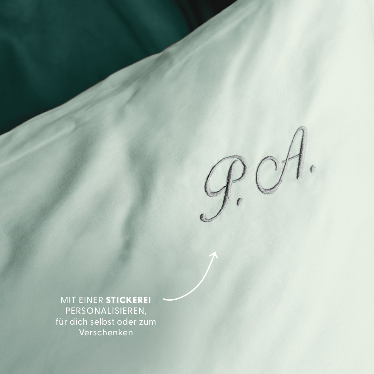 Die Buchstaben werden immer oben rechts gestickt und befinden sich bei Satin Kissenbezüge an der Seite ohne Volant.
