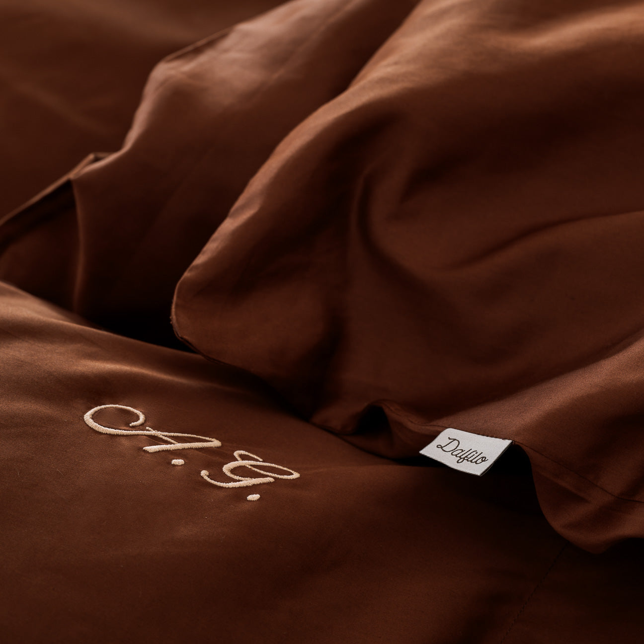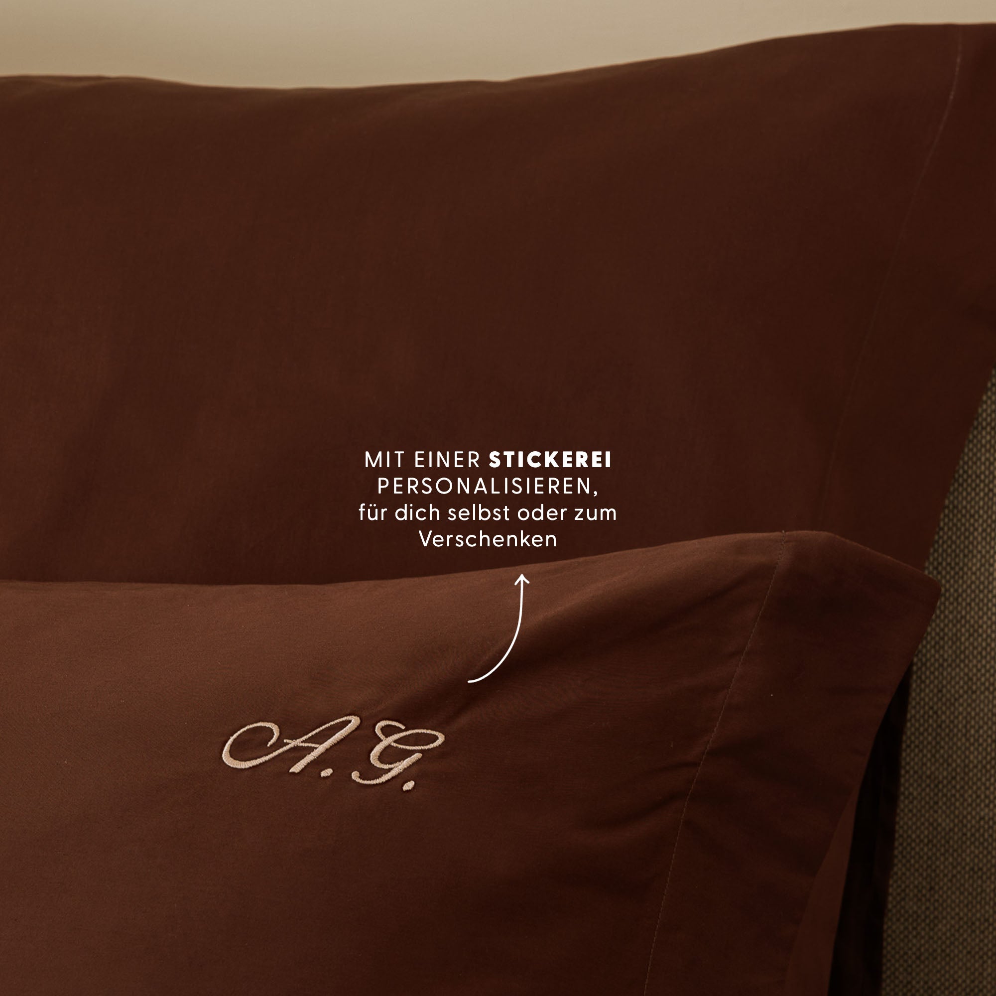 Die Buchstaben werden immer oben rechts gestickt und befinden sich bei Satin Kissenbezüge an der Seite ohne Volant.
