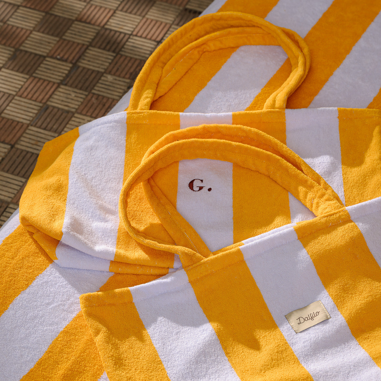 Jedes Teil der Dalfilo-Strandlinie entsteht am Webstuhl – aus dem Zusammenspiel von weißen und farbigen Garnen, garngefärbt mit der IDH-Technik für maximale Beständigkeit gegen Sonne, Chlor, Witterungseinflüsse und häufiges Waschen.