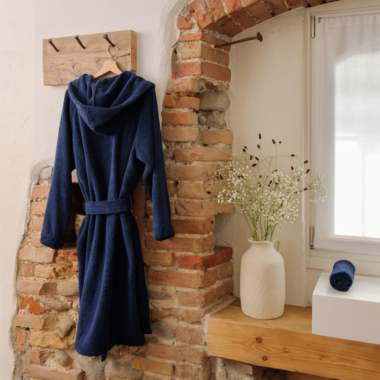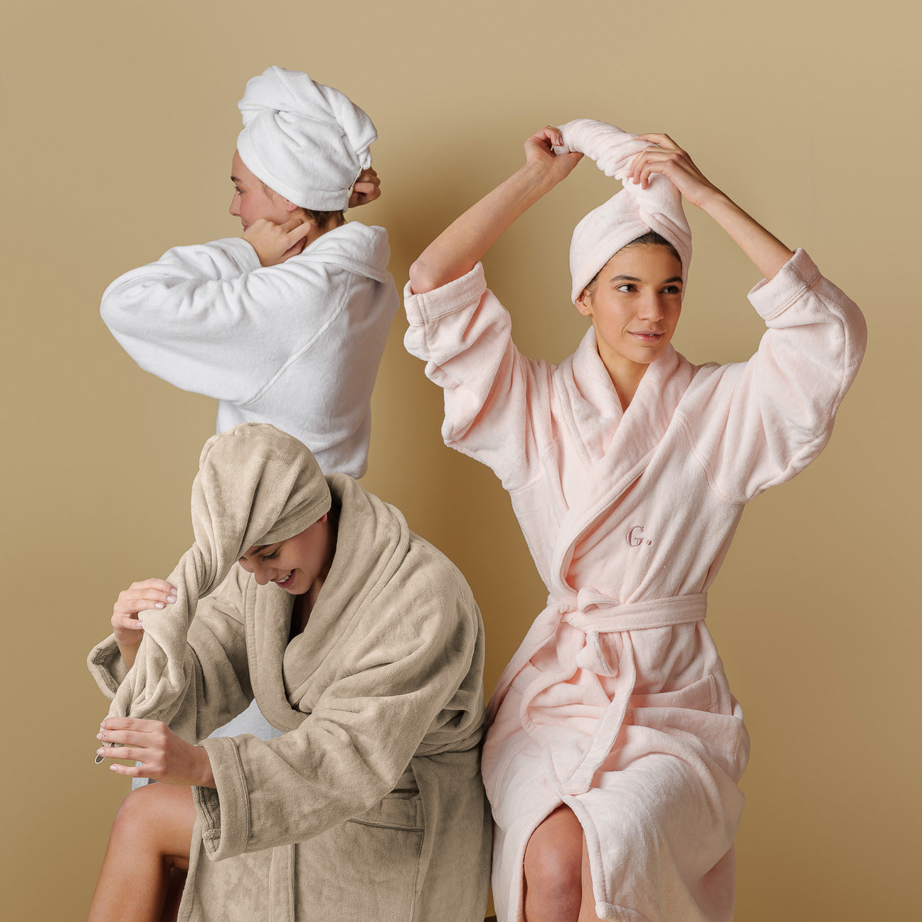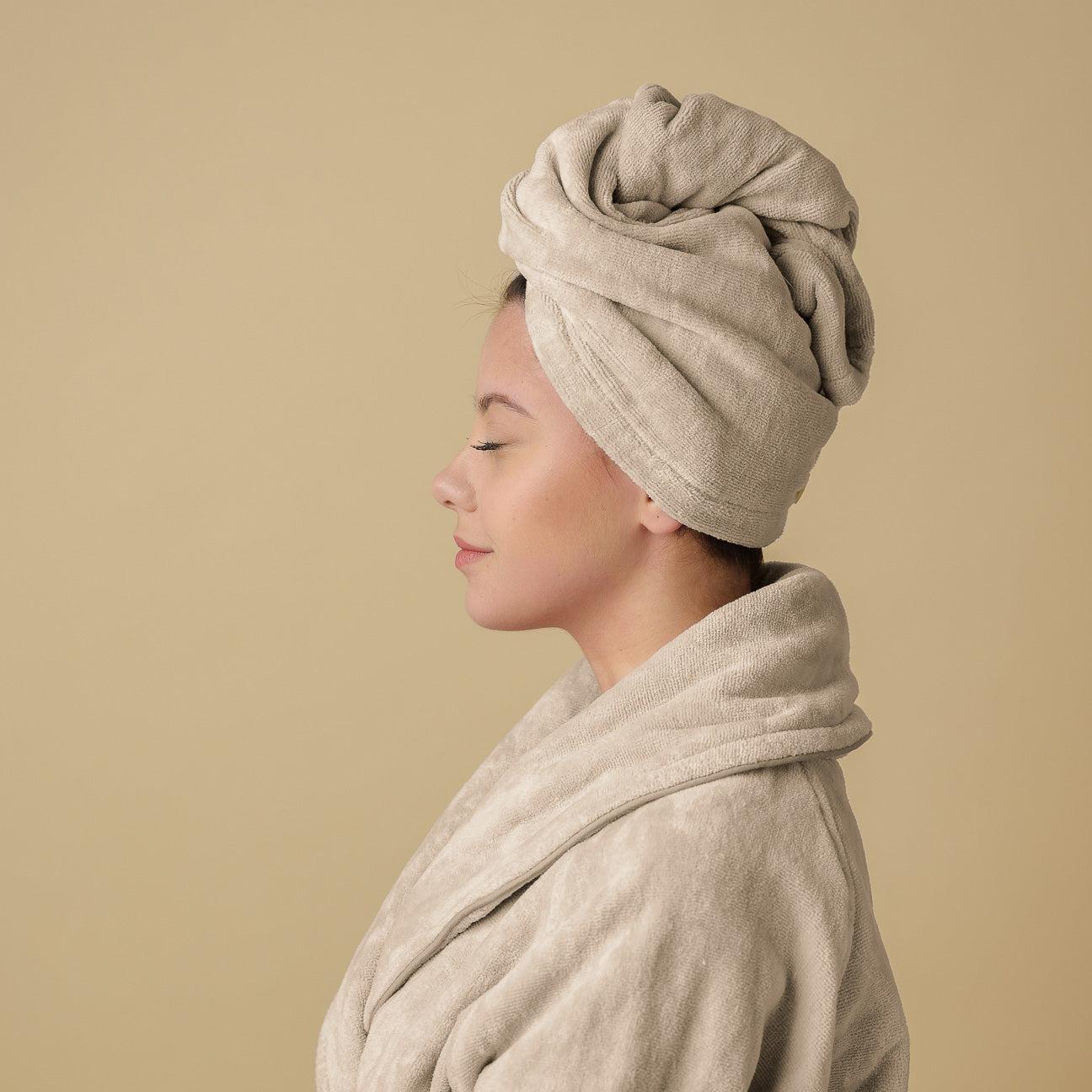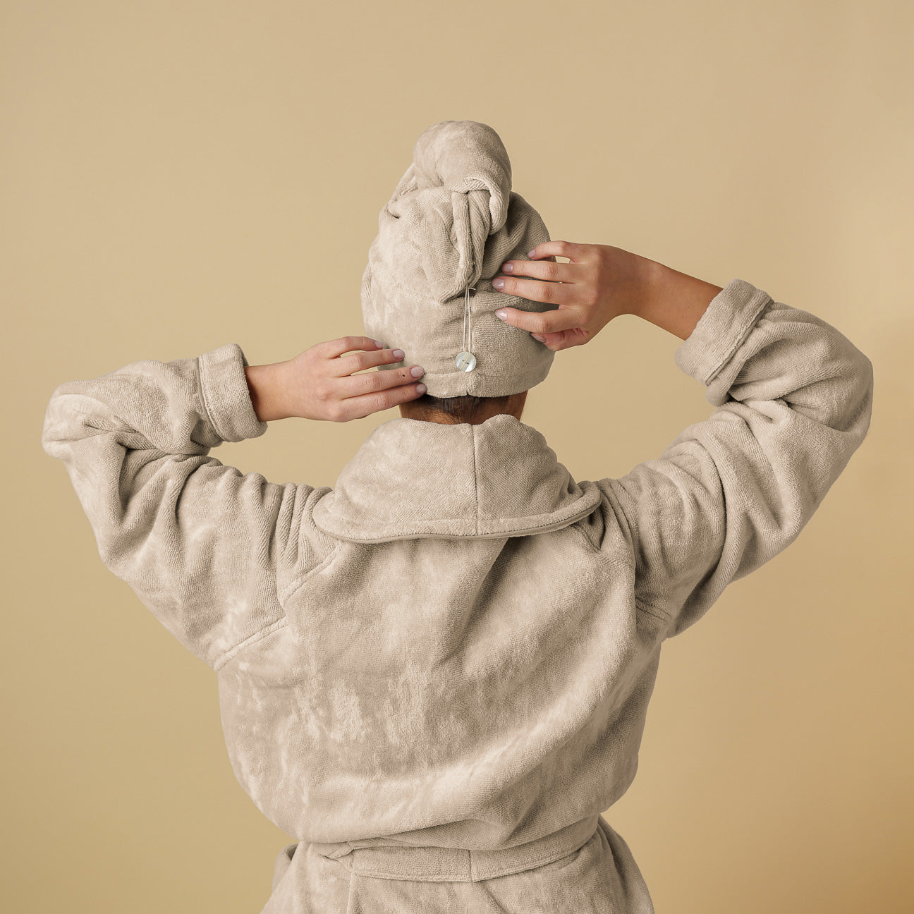 DasTurban Handtuch ist das unverzichtbare Accessoire, um dein Beauty-Ritual zu vervollständigen. Speziell entworfen, um perfekt mit unseren Dolce Vita Bademänteln kombiniert zu werden, verlängert es das Wohlbefinden nach dem Bad oder der Dusche. Dank seiner hohen Saugfähigkeit und dem praktischen Knopfverschluss wird das Trocknen der Haare zu einem verwöhnenden Erlebnis. Der gekämmte Baumwollstoff streichelt sanft die Kopfhaut und verwandelt eine alltägliche Geste in ein wahres Spa-Ritual.
